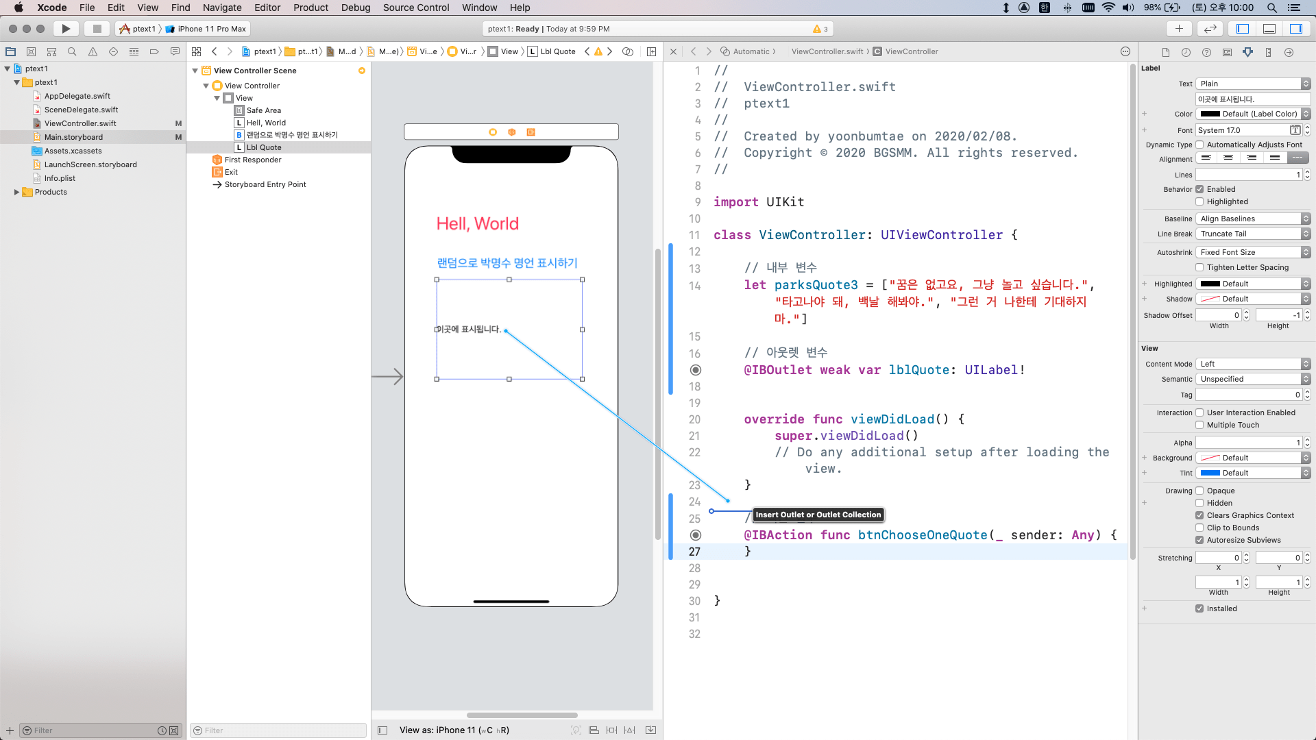iOS 프로그래밍: 스토리보드에서 요소를 추가한 뒤 아웃렛 변수와 액션 함수로 연결하기