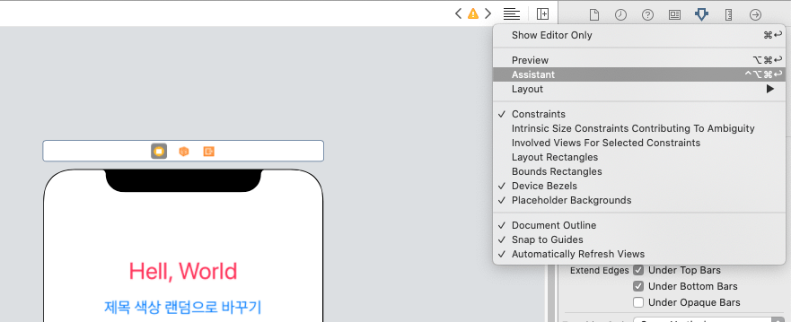 먼저 어시스턴트 코드 창을 띄우겠습니다. 스토리보드 편집창 오른쪽 상단에 줄 여러개 있는 아이콘을 클릭한 뒤 Assistant를 클릭하면 어시스턴트 코드 창이 나옵니다. 아래 스크린샷은 코드를 작성한 상태에서 찍은 것인데 원래는 viewDidLoad 함수만 나오고 나머지는 아무것도 없습니다.