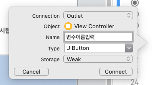 참고로 해당 요소가 아웃렛 변수로 연결되는지, 아니면 액션 함수로 연결되는지 여부는 Xcode가 알아서 추천해주므로 따로 신경쓰지 않아도 됩니다.