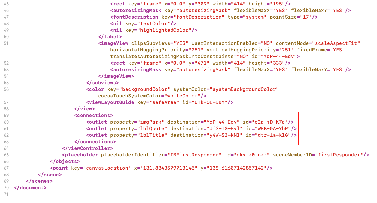 연결되는 원리는 스토리보드의 XML을 보면 알 수 있습니다. 이 XML은 사용자가 작성하는 것이 아니고 Xcode가 작성해 주는 것이므로 참고만 하면 됩니다.