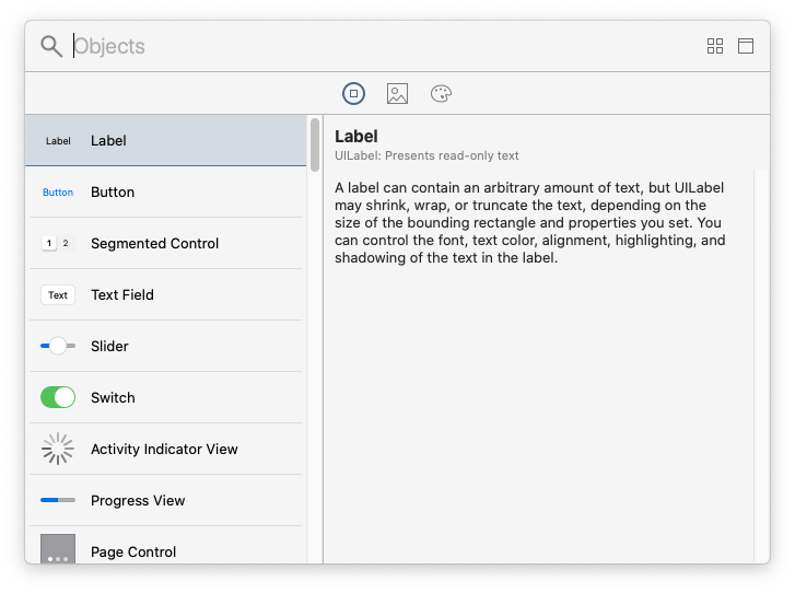 Xcode의 오른쪽 상단을 보면 + 버튼이 있습니다. 이것을 클릭하면 아래 화면이 나옵니다. Label과 Button, Image View를 스토리보드에 드래그해 요소들을 추가합니다.