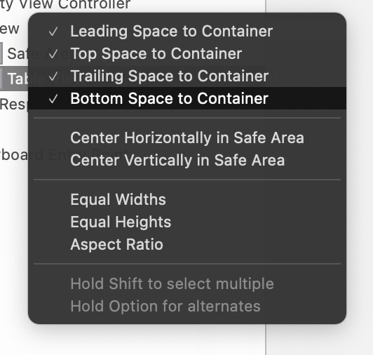 shift버튼을 누른 채 메뉴를 클릭해 위의 그림처럼 체크박스를 표시합니다. 이후 제약(constraints)가 생기며 자동 레이아웃이 설정됩니다.