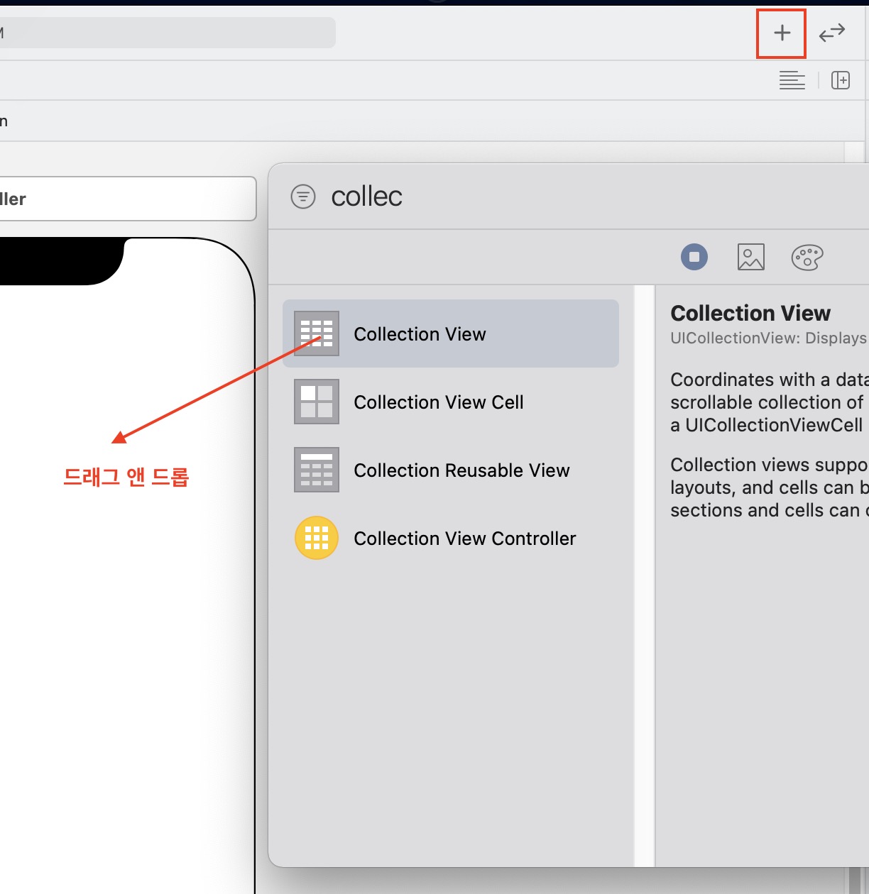 [+]버튼을 클릭합니다. Collection View오브젝트를 메인 뷰로 끌어와 추가합니다.