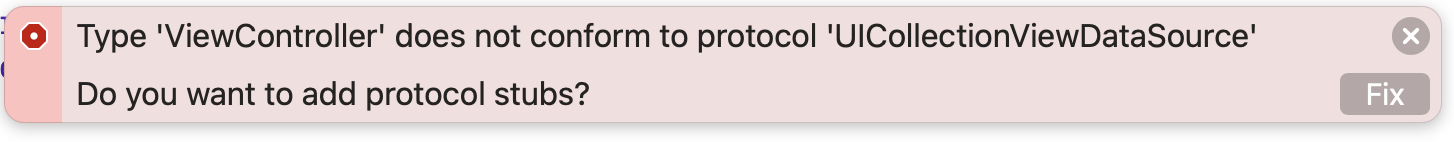위 부분을 추가하면 아래와 같은 에러가 발생할 것입니다.[Fix] 버튼을 눌러 프로토콜 조각(protocol stub)을 추가합니다.