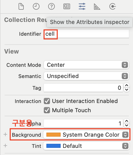 Show the Attributes Inspector(위 그림의 빨간 박스 아이콘)를 선택한 뒤,Identifier에 아까 프로토콜 조각에서 지정했던cell구분자를 입력합니다. - 셀이 표시되는지 구분하기 위해