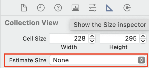 크기를 임의로 조정하려면 뷰 컨트롤러 클래스에 UICollectionViewDelegateFlowLayout 를 추가하고 스토리보드에서 컬렉션 뷰의 Estimate Size 를 None으로 설정합니다.