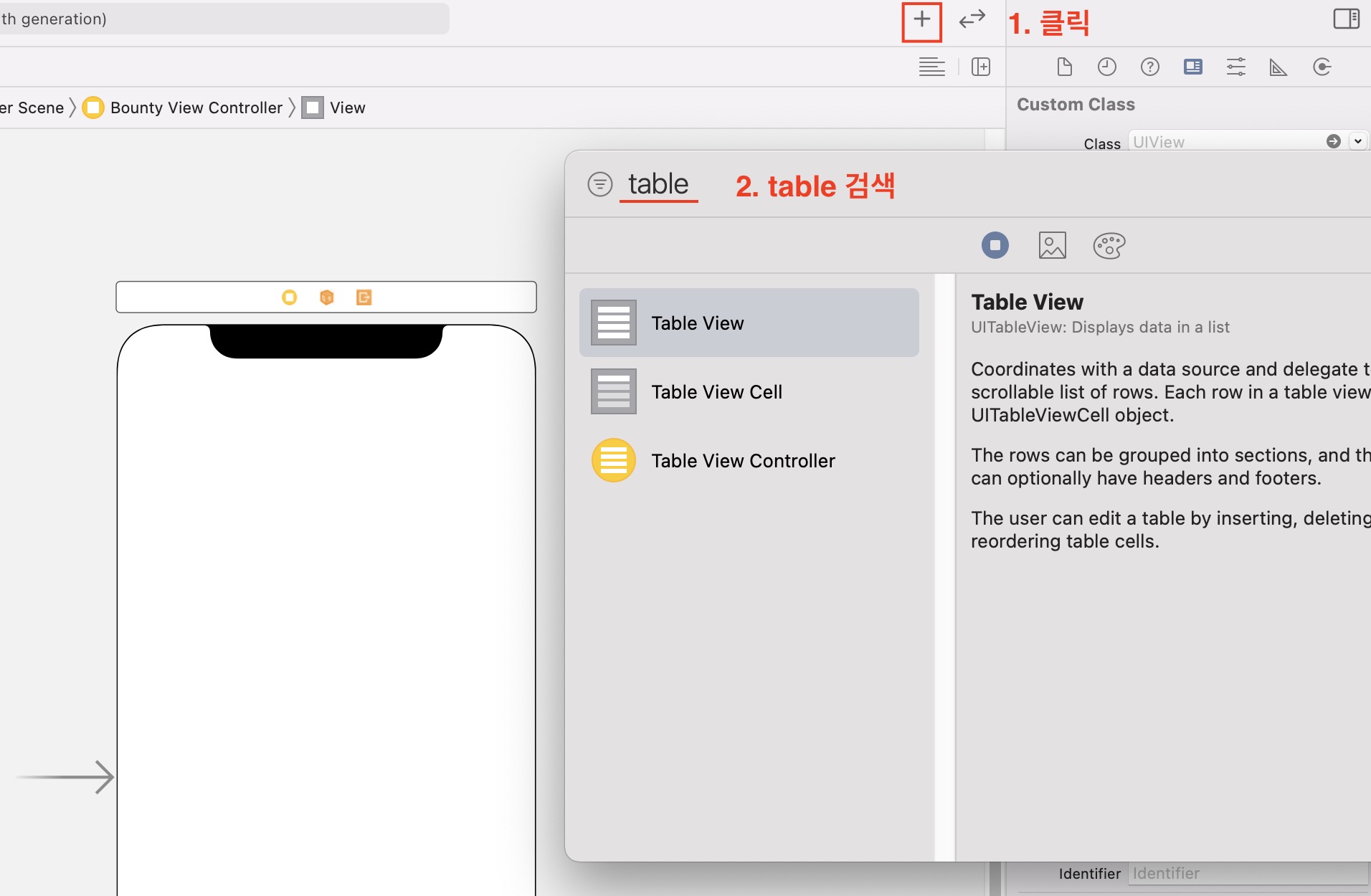 [+]버튼을 클릭합니다. table을 검색한 뒤Table View오브젝트를 메인 뷰로 끌어와 추가합니다.