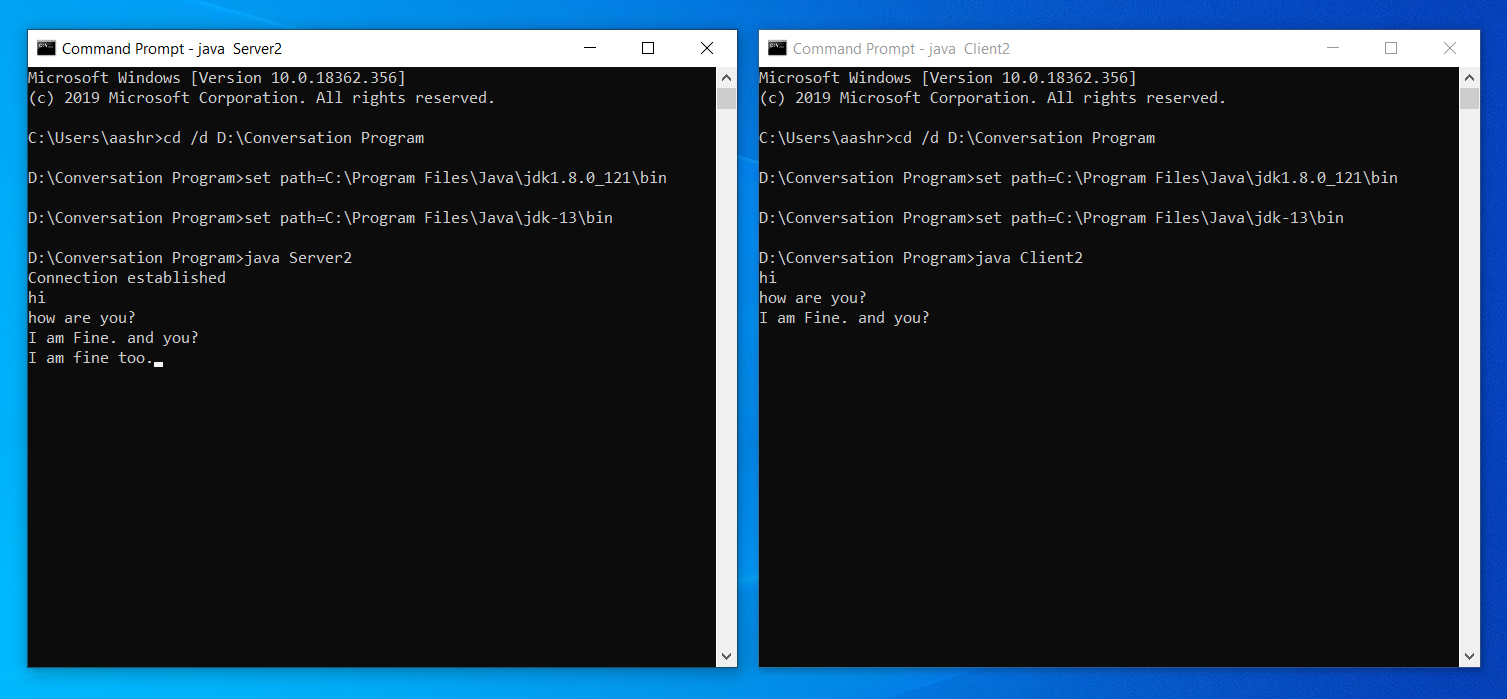 지금 예제는 별도의 스레드 설계가 되어있지 않으므로 1:1 통신만 가능하며 순차적으로만 작업을 수행할 수 있습니다. 예를 들어 서버가 특정 작업을 마치고 나서야 클라이언트가 다음 작업을이어 할 수 있으며, 동시에 통신하는것은 아직은 불가능합니다.