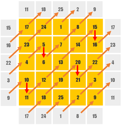 마방진(魔方陣)은 n2개의 수를 가로, 세로, 대각선 방향의 수를 더하면 모두 같은 값이 나오도록 n × n 행렬에 배열한 것이다. (…) n이 홀수일 때에는 마방진을 간단한 방법으로 만들 수 있다. 첫 번째 행의 가운데 칸에 1을 넣는다. 이어서 다음과 같은 규칙으로 숫자를 채운다. 다음 숫자를 대각선 방향으로 오른쪽 위 칸에 넣는다. 이때 해당하는 칸이 마방진의 위쪽으로 벗어난 경우에는 반대로 가장 아래쪽의 칸으로, 마방진의 오른쪽으로 벗어나는 경우는 가장 왼쪽의 칸으로 각자 한번 더 이동한다. 그리고 다른 수가 오른쪽 위 칸에 있어도 경우에 따라 수직 또는 수평으로 이동한다.
