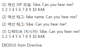 액션 태그와 디렉티브를 비교하는 예제입니다. 두 부분 모두 이름, 반복문, 임의의 변수(customVariable)의 네ㅐ용을 표시하는 것을 목적으로 합니다. 결과를 보니 디렉티브는 모든 내용이 정상적으로 표시되는 반면 액션 태그는 뭔가 잘 실행이 안된 모양이며 심지어 파라미터를 다시 설정하지 않으면 컴파일 에러까지 발생합니다.