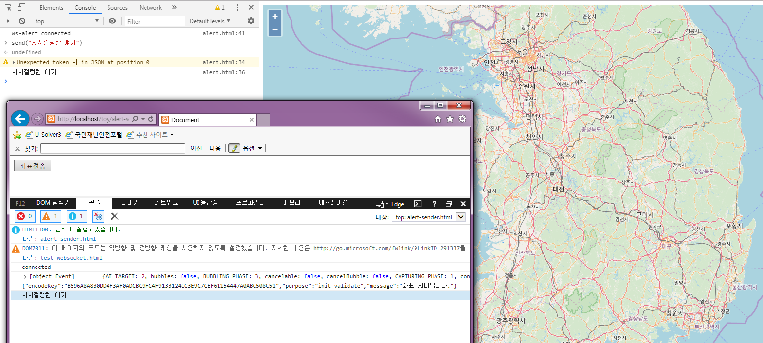 클라이언트 측에서는 계속 대기하고 있다가 서버에서 긴급 상황(?)이 일어났다는 신호와 지도 좌표를 보내면 즉시 해당 좌표에 경고 상황이 일어났다고 표시하는 웹 페이지를 만들어볼 것이다. 실제 시스템이 어떻게 동작하는지는 모르겠고 뇌내망상으로 진행함.