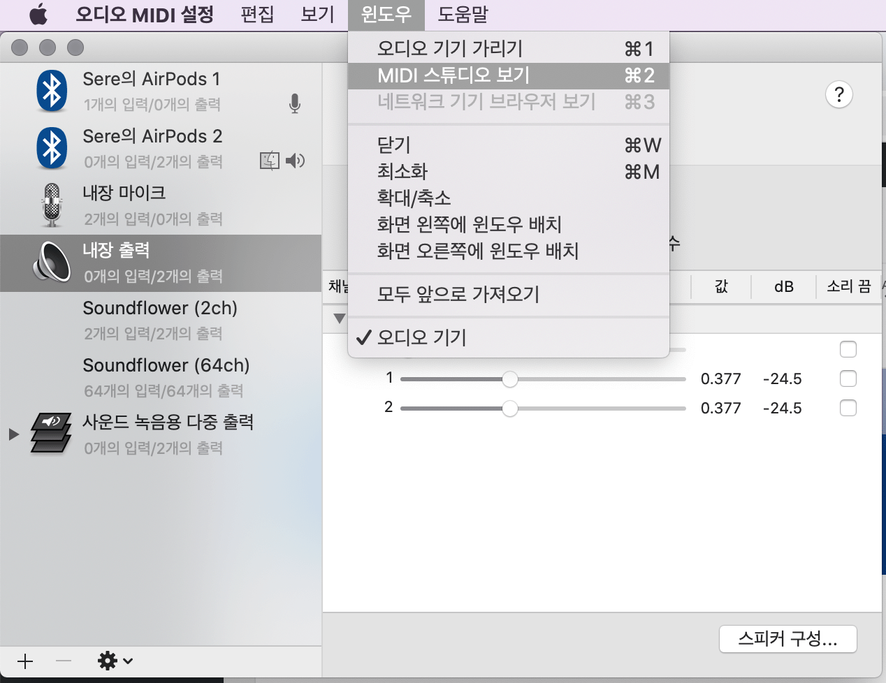 프로그램을 실행하면 맨 위에 [윈도우] > [MIDI 스튜디오 보기] 라는 메뉴를 실행합니다. (단축키: command + 2)