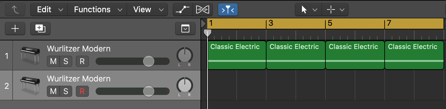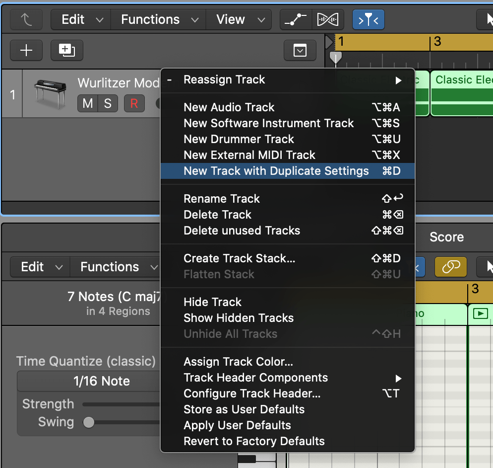 로직으로 돌아온 다음 원래 트랙을 [New Track with Duplicate Settings] 기능을 이용해 복사합니다. (단축키 command + D)
