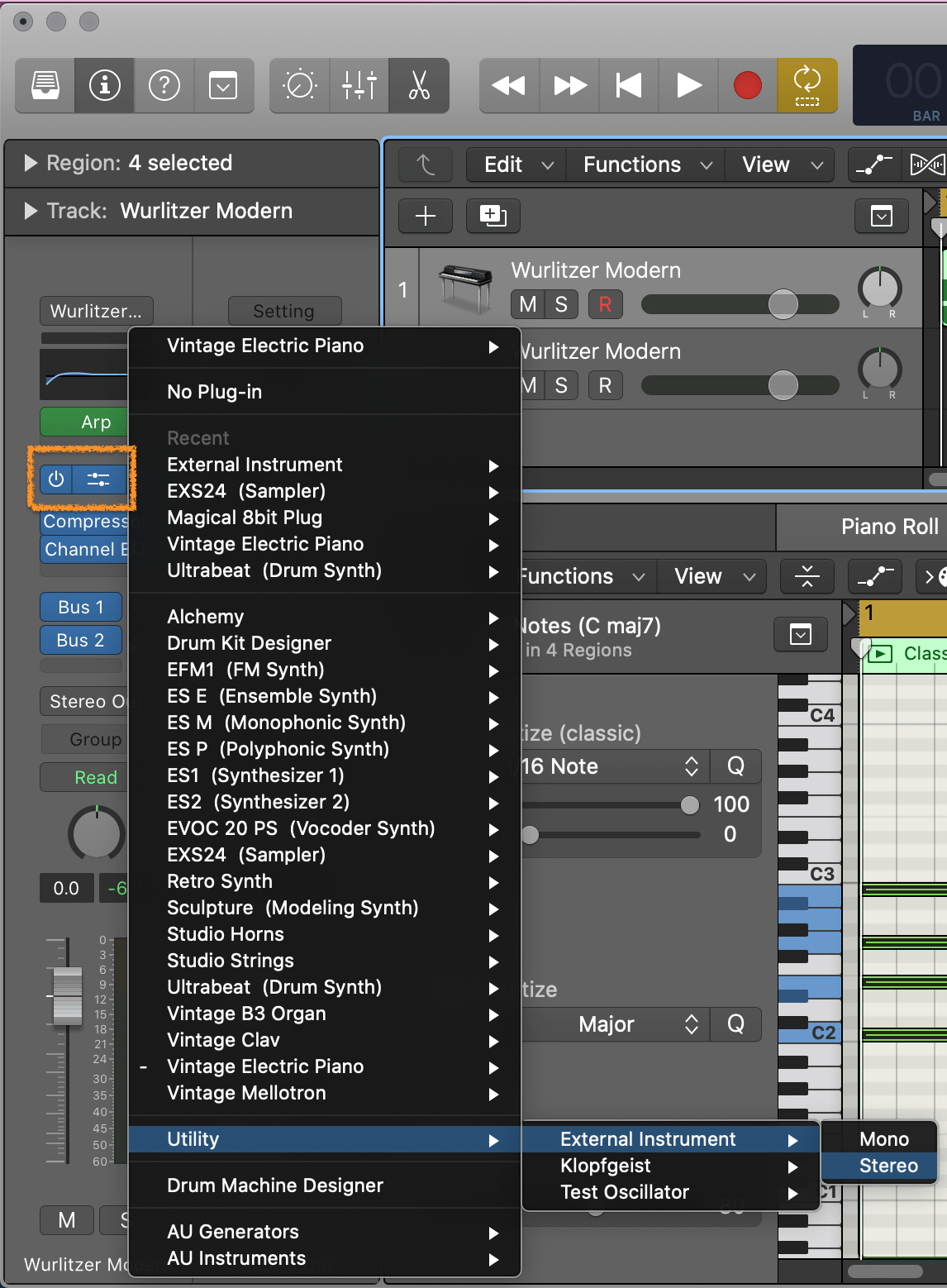 원본 트랙을 클릭한 상태에서 왼쪽의 인스펙터(Inspector) 창을 보면 가상악기를 설정하는 부분이 있는데 (주황색 박스) 이 부분을 클릭하고 악기를 [Utility] > [External Instrument(Stereo)] 로 변경합니다.