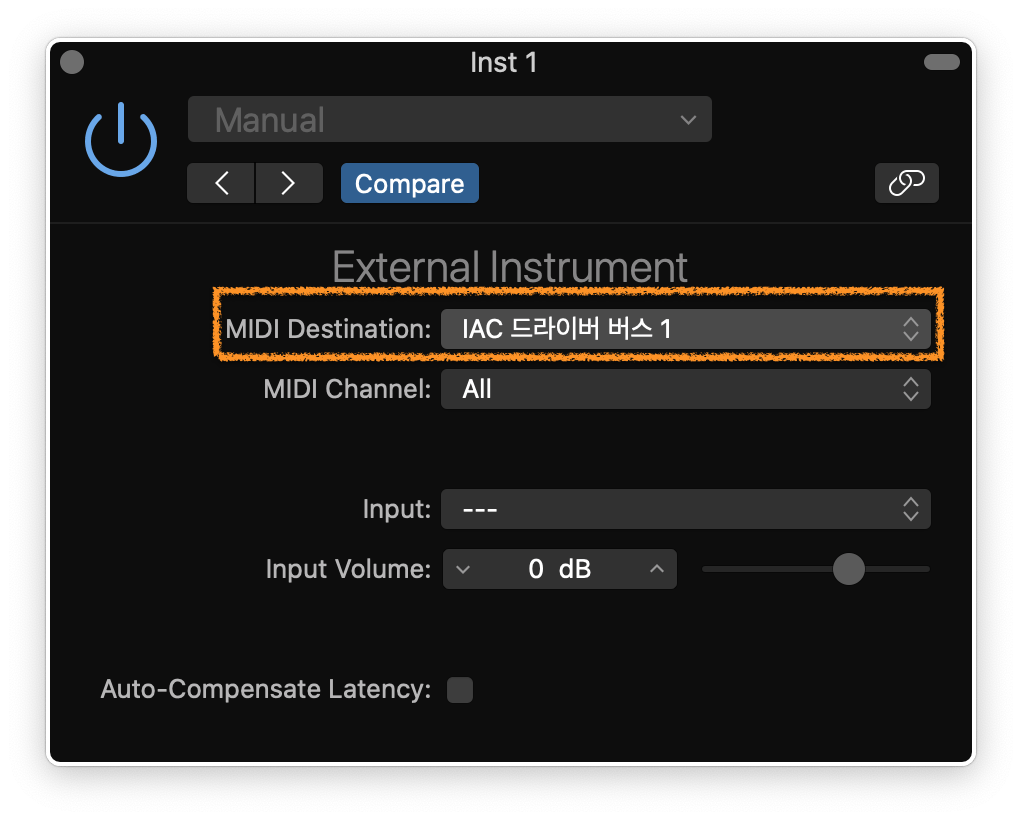External Instrument 설정창에서 [MIDI Destination]을 온라인 상태인 [IAC 드라이버 버스]로 변경합니다.