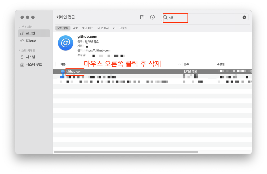 2. 검색창에 git을 검색한 뒤 ‘인터넷 암호’ 종류의 github.com 항목을 삭제합니다.