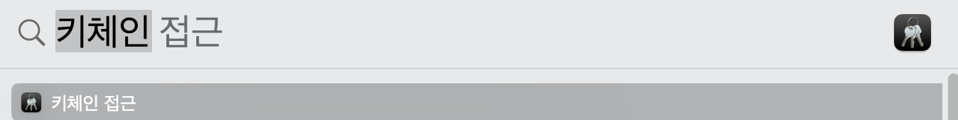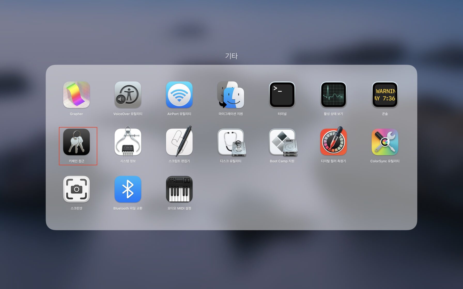 1. Spotlight 검색창 또는 Launchpad > 기타 폴더에서 ‘키체인 접근’이라는 응용프로그램을 실행합니다.