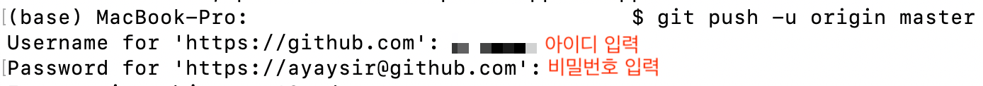 3. 다시 push를 시도하면 아이디, 비밀번호 입력창이 나오는데 정확하게 입력합니다.