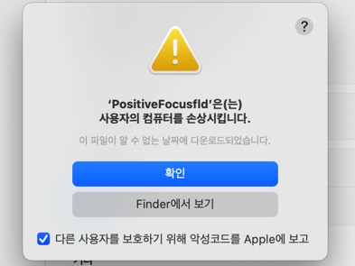 - 보안 경고 메시지: “Mac에 손상을 입힐 수 있음” 또는 “확인되지 않은 개발자가 배포함”