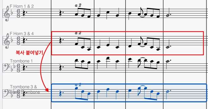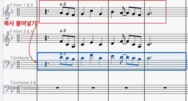 F Horn 3 & 4의 악보를 임시로 사용하기 위해 1번과 동일한 영역을 선택한 뒤 바로 밑 Staff인Trombone 3에 복사 붙여넣기합니다. - 합칠 두 파트를 선택한 뒤 상단 메뉴