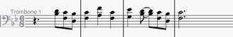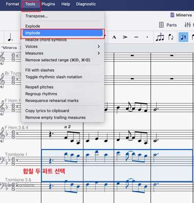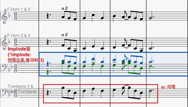 Implode기능과 특별한 선택 두 기능을 사용해서 호른 두 파트를 아래 Trombone 1 처럼 합칠 수 있습니다.- implode 뜻: 자체적으로 파열되다, 폭파하여 안쪽으로 붕괴하다; (문화 따위가) 한 점에 집중하다, 통합되다