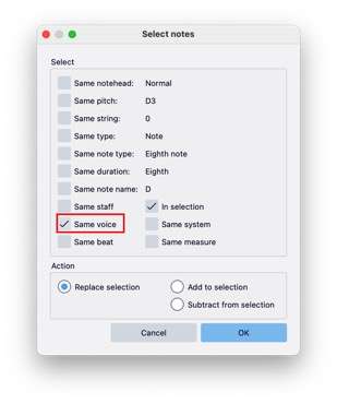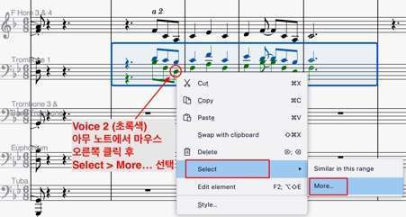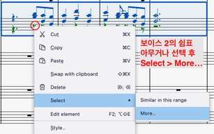 초록색(Voice 2 선택색상)의아무 노트를 선택한 후마우스 오른쪽 버튼 > Select > More...를 클릭합니다. Same voice체크박스를 클릭한 뒤OK버튼을 누릅니다.- 보이스 1은 선택 해제되고 보이스 2(초록색)만 선택된 상태가 됩니다.