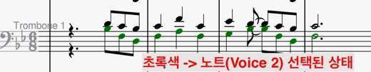 Voice 1)로, 하단 부분(Trombone 3)은 초록색(Voice 2)로 합쳐졌습니다. Trombone 3에 임시로 붙여넣은 악보는 삭제합니다.