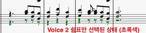 아무 쉼표(rest)를선택한 후마우스 오른쪽 버튼 > Select > More...를 클릭합니다.Same voice체크박스를 클릭한 뒤OK버튼을 누릅니다. - 보이스 2(초록색)의 쉼표만 선택된 상태가 됩니다. 키보드의