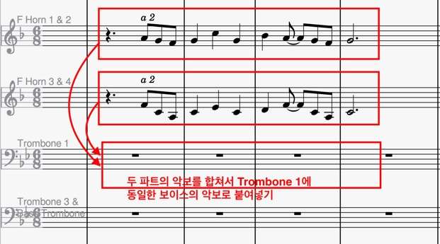 F. Horn 1 & 2,F. Horn. 3 & 4의 악보를Trombone 1악보에 합쳐서 같은 보이스(Voice)로 이루어진 Trombone 1 악보처럼 만들려고 합니다.- Voice가 다르면 악보 모양 자체가 달라지고, 두 성부의 리듬이 같은 경우에는 같은 보이스로 관리하는 것이 편리한 경우가 있습니다.