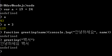 6. 자바스크립트 파일(*.js)은 다음과 같이 실행합니다. (프롬프트에 node 파일이름.js)