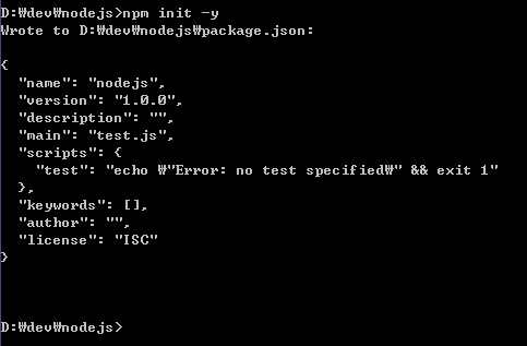 지금은 역할을 잘 모르겠지만 package.json을 생성합니다. -y를 붙이면 기본옵션으로 생성하며 파라미터를 붙이지 않으면 질문이 수 차례 나오는데, 이름, 버전 등을 입력하는 옵션입니다. 일단은 기본값으로 생성하는 -y 옵션을 선택합니다.