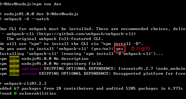 원래 webpack-cli 라는 것도 설치했어야 하는데 안했으므로 추가 설치 여부를 물어보는 장면입니다. yes를 키보드로 입력해 추가로 설치합니다.