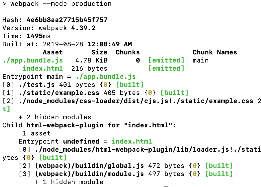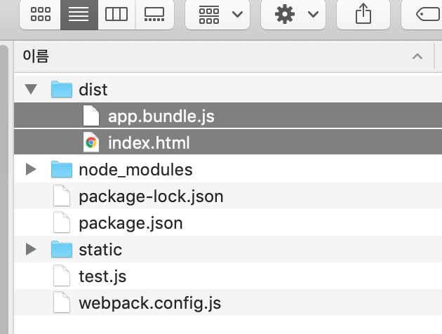 아래와 같은 화면이 나왔다면 정상적으로 빌드된 것입니다. dist 폴더에서 app.bundle.js와 index.html 파일이 있는지 확인합니다.
