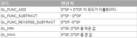 sfactor와 dfactor는 S색상과 D색상에 각각 적용할 연산식을 정의하며 mode는 두 연산 결과를 합칠 방법을 정의한다. 모드에 따른 연산식은 다음과 같다.