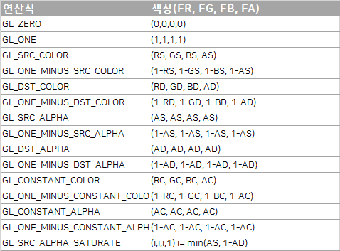 블렌딩은 색상 버퍼에 이미 기록되어 있는 값 D와 새로 기록되는 값 S와의 연산을 정의한다. 연산 방법은 다음 두 함수로 지정한다.