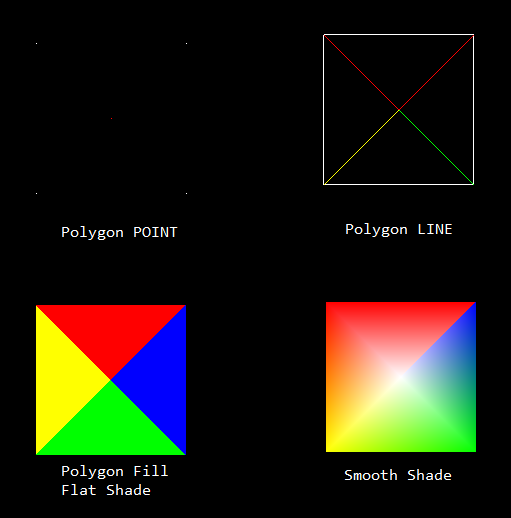 GL_SMOOTH 모드인 경우는 모든 정점의 색상을 섞어서 사용한다. 각 정점은 지정한 색으로 채색되고 중간 지점은 정점에서 떨어진 거리만큼 부드럽게 섞인다. 쉽게 말해서 그라데이션 처리된다. 다음 함수는 다각형의 폴리곤 모드를 지정한다.