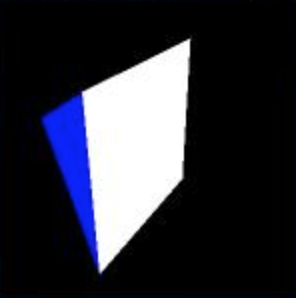 이번에는 near를 조정해 보자.(i, k 키) -near가 0.8이면 가시 영역의 전면이 피라미드의 꼭지점과 일치하므로 피라미드 전체가 보인다. 그러나 0.8보다 더 작아지면 꼭지점이 가시 영역을 벗어나므로 보이지 않는다. 피라미드의 꼭지점 보다 더 아래쪽에서 자르기 때문이다. 시점이 피라미드 안으로 들어가 버렸으므로 바닥의 흰면이 보인다.