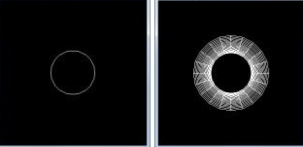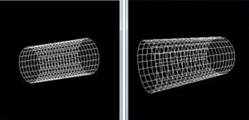 직교 투영을 하면 회전 각도에 상관없이 양 끝의 원 크기가 동일하다. 회전시켜 보면 어느 방향으로 돌고 있는지 잘 분간되지도 않는다. 원근 투영을 하면 가까이 있는 원이 더 크게 보여 훨씬 더 사실적이다. z키를 누르면 회전이 리셋되는데 직교 투영을 하면 양끝의 지름이 똑같아 그냥 원으로만 보이지만 원근 투영을 하면 앞쪽이 훨씬 더 크게 보여 원통형을 위에서 바라본 모양이 된다.