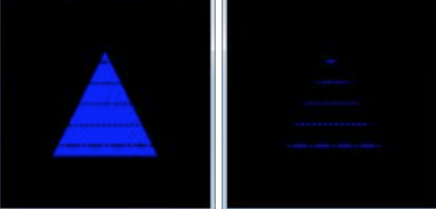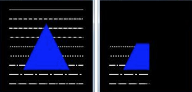 삼각형을 그릴 때는 스텐실 함수를 1과 같거나 다른 값으로 지정했으므로 삼각형의 모든 영역이 그려지지 않고 스템실 버퍼의 값과 비교하여 점선이 지나갔던 영역이나 또는 그 반대 영역만 그려진다. 직전에 그렸던 그림은 색상 버퍼에는 기록되지 않지만 스텐실 버퍼에 기록되어 다음 출력에 영향을 미친다.