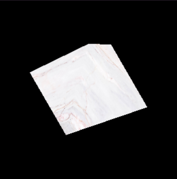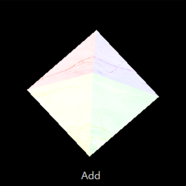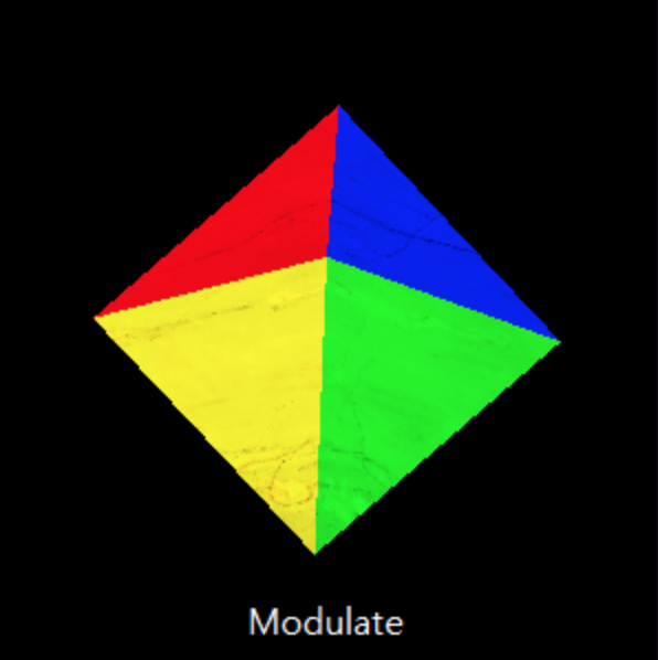 피라미드의 각 면에 고유의 색상이 지정되어 있는데 결합 모드에 따라 이 색상과 텍스처 색상의 연산이 결정된다. REPLACE로 덮어 쓰면 텍스처의 무늬만 나타나지만 MODULATE나 ADD로 혼합하면 면의 원래색과 논리적으로 섞인다. 팝업 메뉴로 모드를 바꿔 보자.
