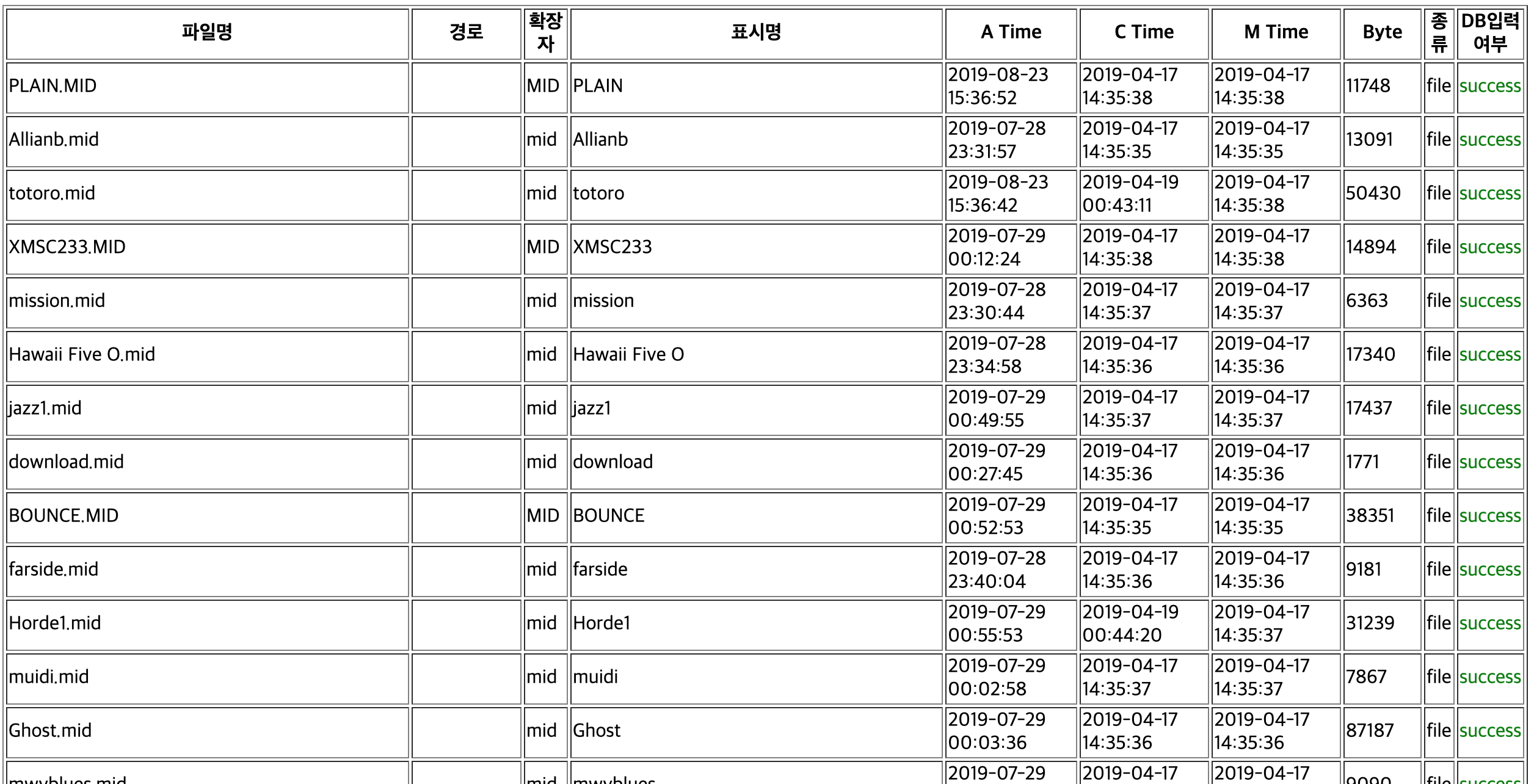 목표는 files 디렉토리(폴더) 내에 있는 파일들을 탐색하고, 파일들의 정보(이름, 확장자, 크기 등)를 표시 및 데이터베이스 테이블에 입력하는 것입니다. 핵심 코드는 아래와 같습니다.