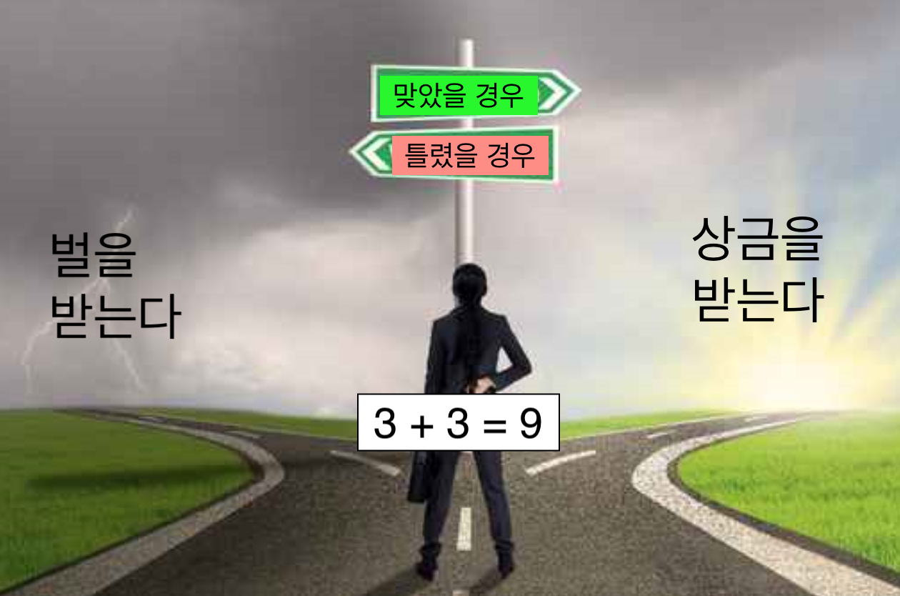 예를 들어, 학생이 3 + 3 = 9 이라는 숙제에 관한 쪽지 하나를 선생님한테 제출하였을 경우, 선생님은 이 식이 맞는 식인지, 아니면 틀린 식인지 알 수 있을 것입니다. 만약 식이 맞다면(true) 학생에게 잘했다는 의미에서 상금을 주고, 식이 틀렸다면(false) 반성하라는 의미로 벌을 줘야 할 것입니다. 여기서 학생이 제출한 쪽지는 조건문에서 ‘조건식’이라 하며, 맞았을 경우를 then, 틀렸을 경우 else라고 합니다. elseif는 밑에서 다시 보겠습니다.