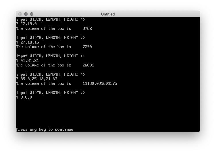 택배 박스의 가로, 세로, 높이 값을 입력받으면 박스의 부피를 알려주는 프로그램입니다. 단, GOTO 문을 이용해서 0,0,0으로 입력(또는 아무 값도 입력하지 않음)하기 전에는 무한으로 프로그램이 반복되도록 합니다.