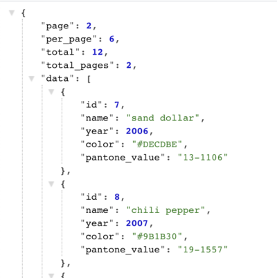 리소스(RESOURCE) 이름으로 임의의 이름을 입력하면 고정된 데이터를 반환합니다. 어떠한 리소스 이름을 입력하더라도 반환되는 데이터는 아래에 있는 그림과 같습니다. page 라는 파라미터를 가지며 생략된 경우 1페이지를 가져옵니다.