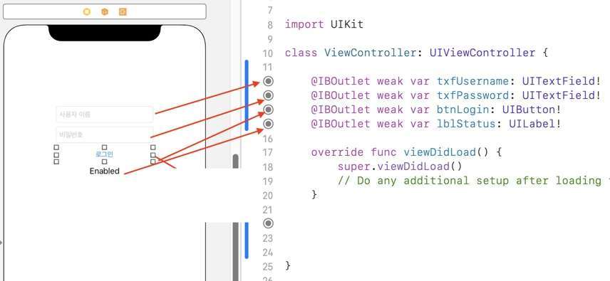 UITextField의 값을 뷰모델의 BehaviorRelay property인username,password에 바인딩합니다.- 뷰모델의