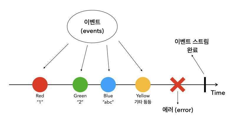 이벤트 스트림의 흐름을 그림으로 나타낸것을 마블 다이어그램(Marble Diagram)이라고 합니다. 동그라미 모양이 이벤트 발생, X 표시는 에러의 발생, 세로 막대기는 이벤트 스트림의 완료를 의미합니다.