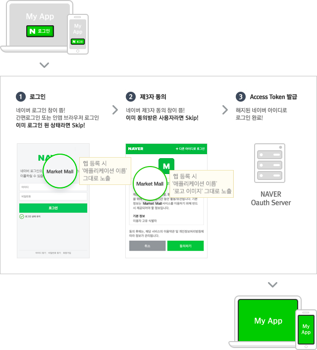 - 클라이언트 키, 콜백 URL을 포함한 로그인 기능 요청을 네이버 측으로 전송