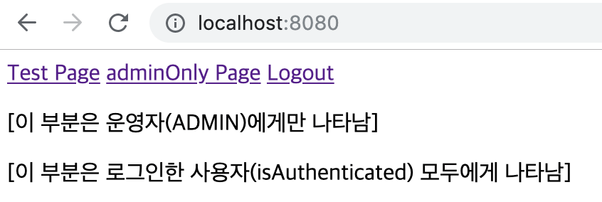 <p sec:authorize="isAuthenticated()">[이 부분은 로그인한 사용자(isAuthenticated) 모두에게 나타남]</p>
