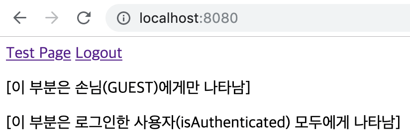 <p sec:authorize="hasRole('GUEST')">[이 부분은 손님(GUEST)에게만 나타남]</p>