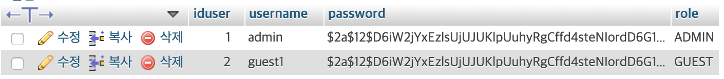 참고로 현재 시큐리티 암호 인코딩은 Bcrypt로 기본 설정되어 있습니다. 이것에 맞춰 암호를 미리 인코딩합니다. (원문: 1234, round: 12)